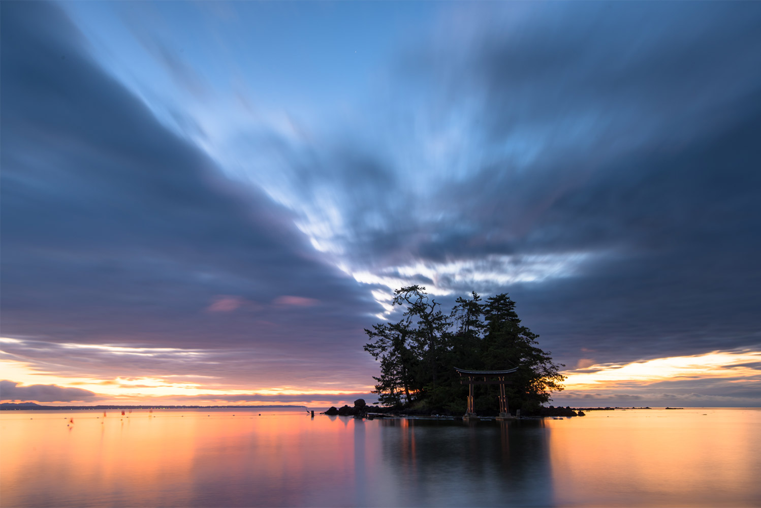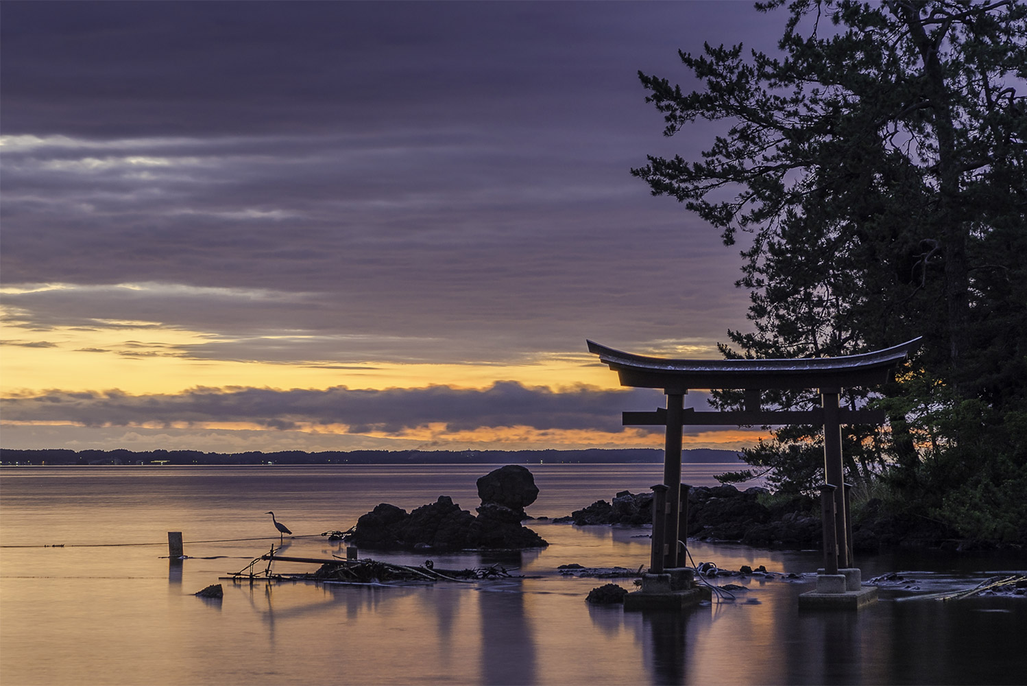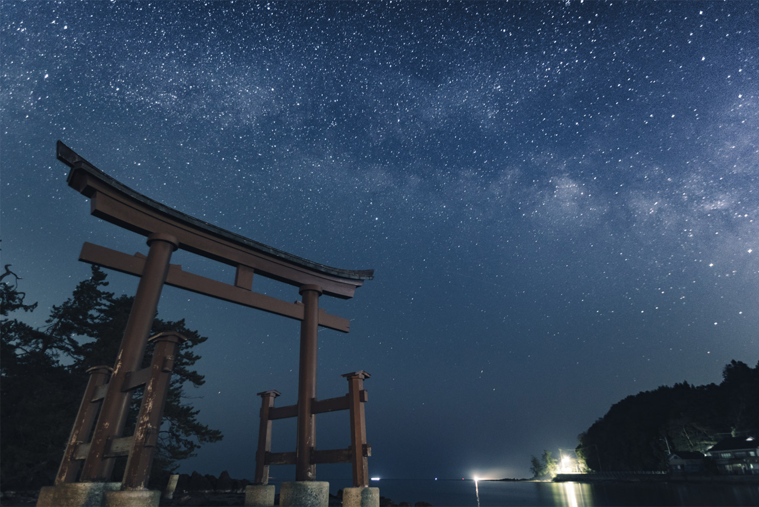 見附島のお隣に位置し車だと5分程度で移動できます場所に恋路海岸はあります。朝日が地平線の向こうから上がり条件が良ければとても神秘的な雰囲気になる場所です。逆光になるので撮影の位置に必要です。夜はひき潮になり鳥居近くまで歩いて行くことができ鳥居を入れた天の川の撮影もできます。撮影に夢中になり海水が上昇するのを忘れないように注意してください。